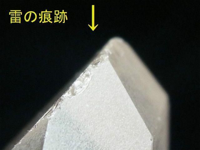 水晶の表面には雷水晶特有のギザギザの伝導跡や、一瞬の高温による白濁、周辺の泥土を伴い溶かされた跡、すさまじい衝撃によるクラックなどが特徴として見られます。